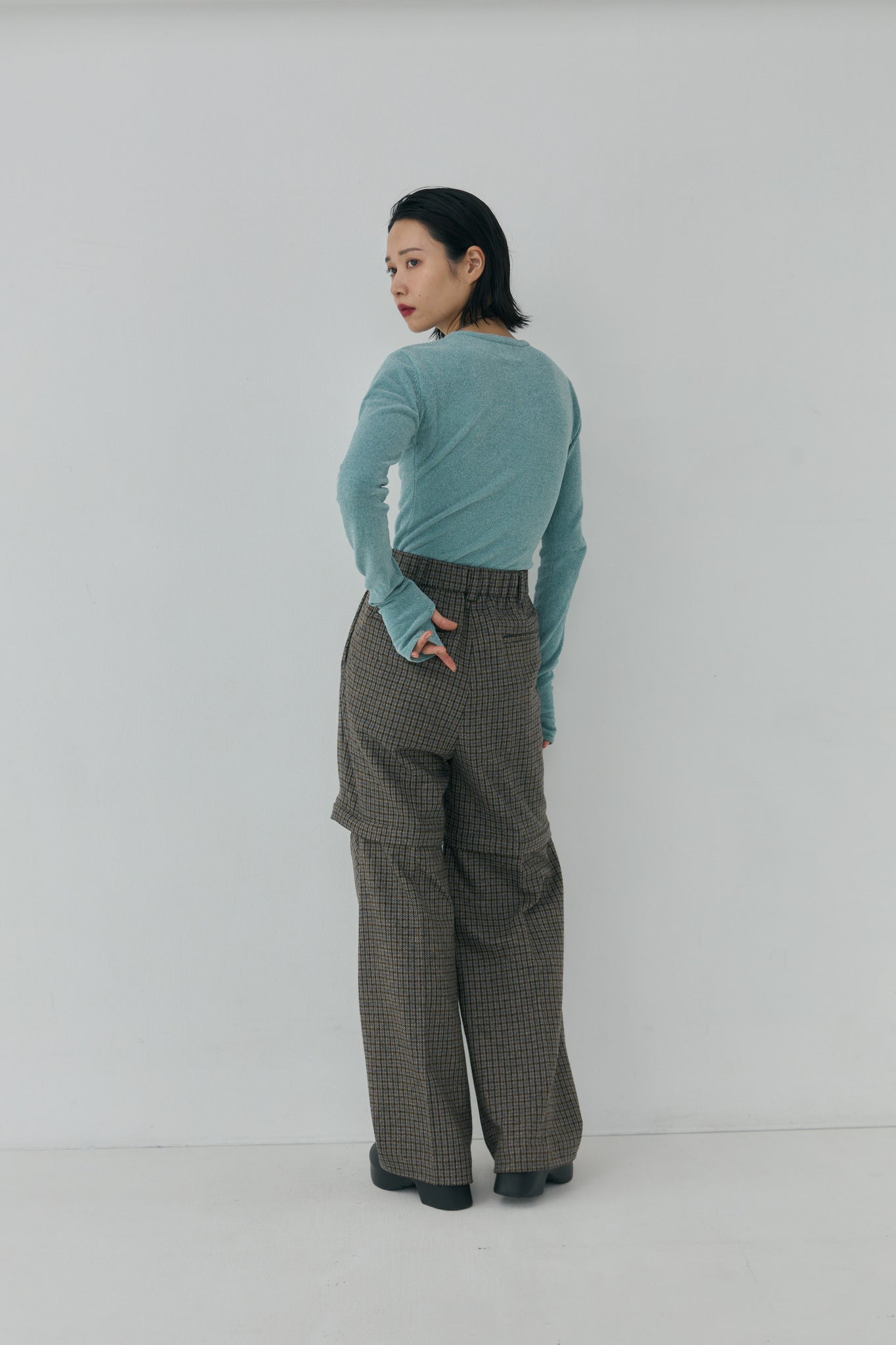 異なるチェックの2色展開となります。柄により生地の厚みが変わり、同サイズですがフォルムの出かたや、落ち感が異なります。