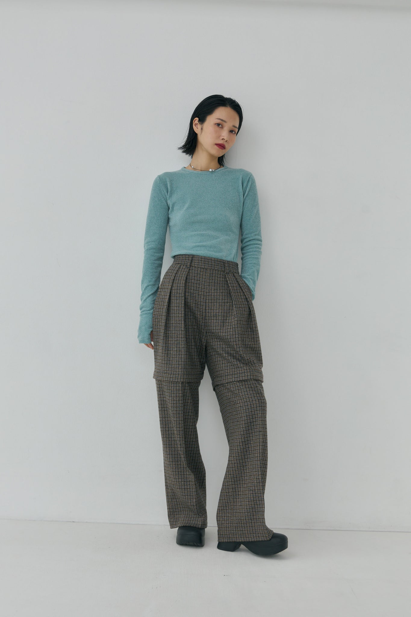 今シーズンは、反毛したリサイクルウールを使用したセンタープレスのセミワイドシルエット。