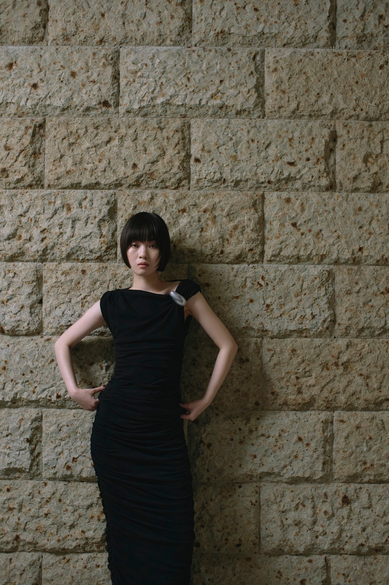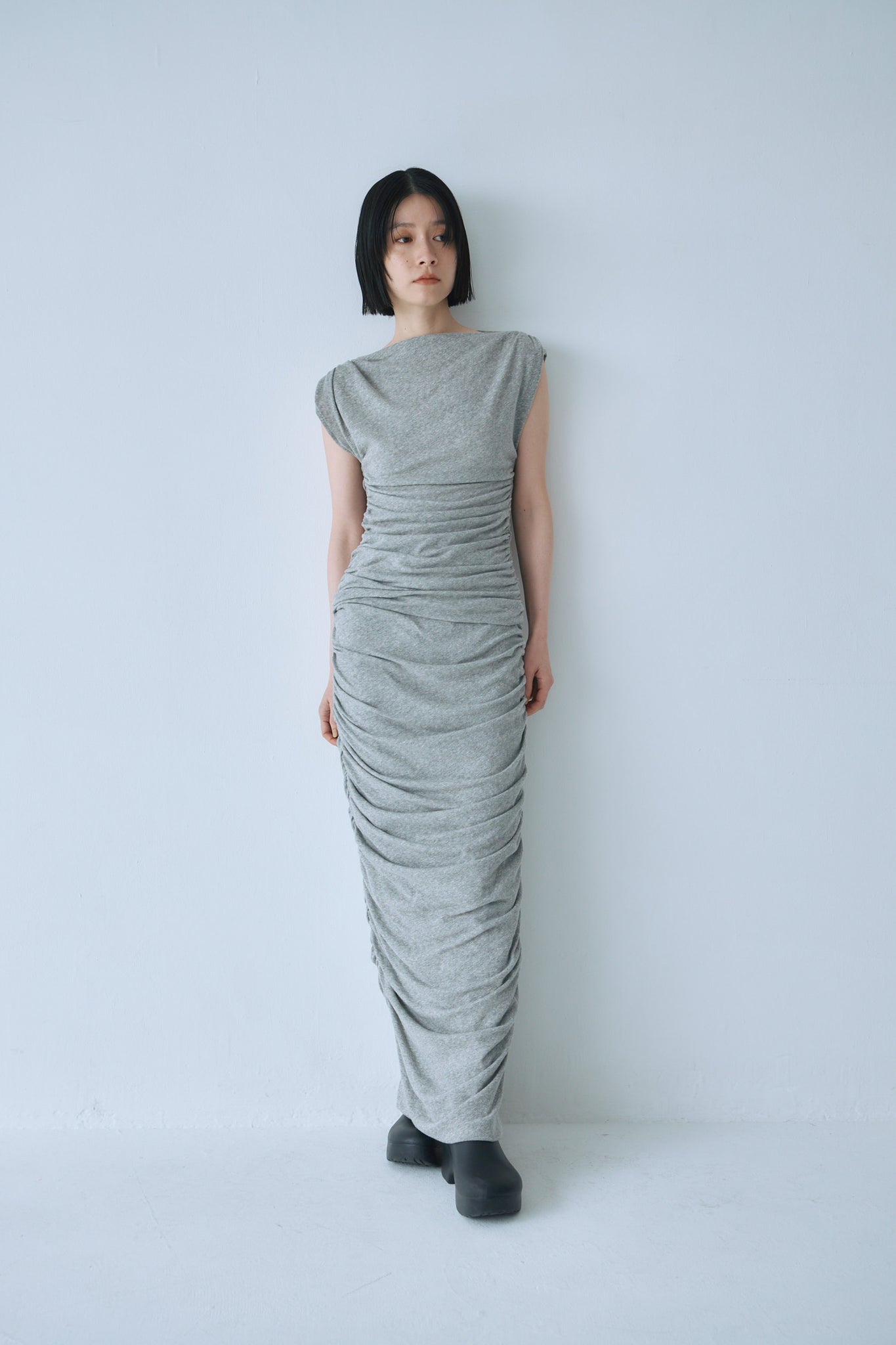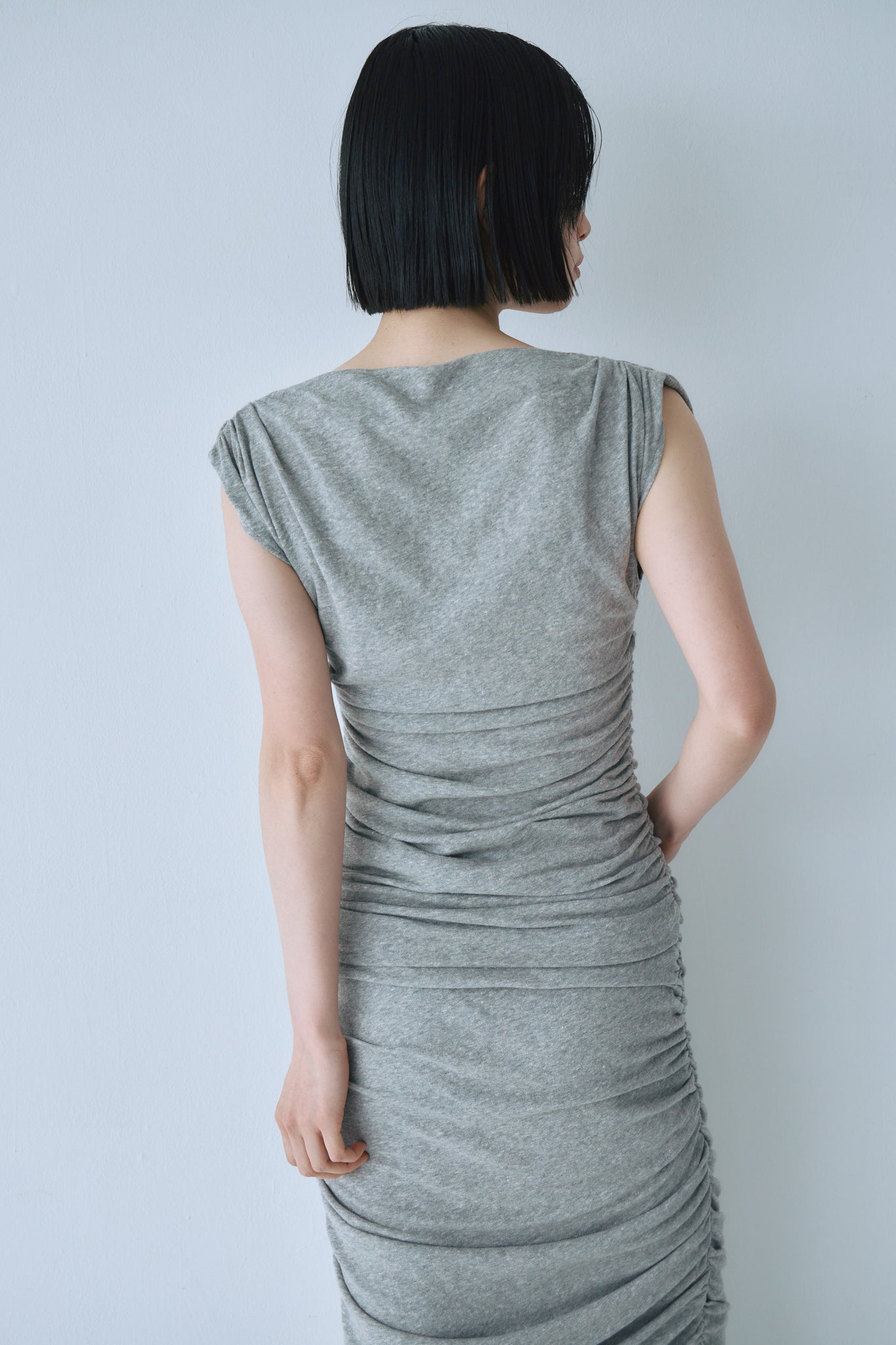 フィットするシルエットですが、身頃の両サイドに入ったギャザーとストレッチ効果で強調され過ぎず美しいボディラインを作ります。
