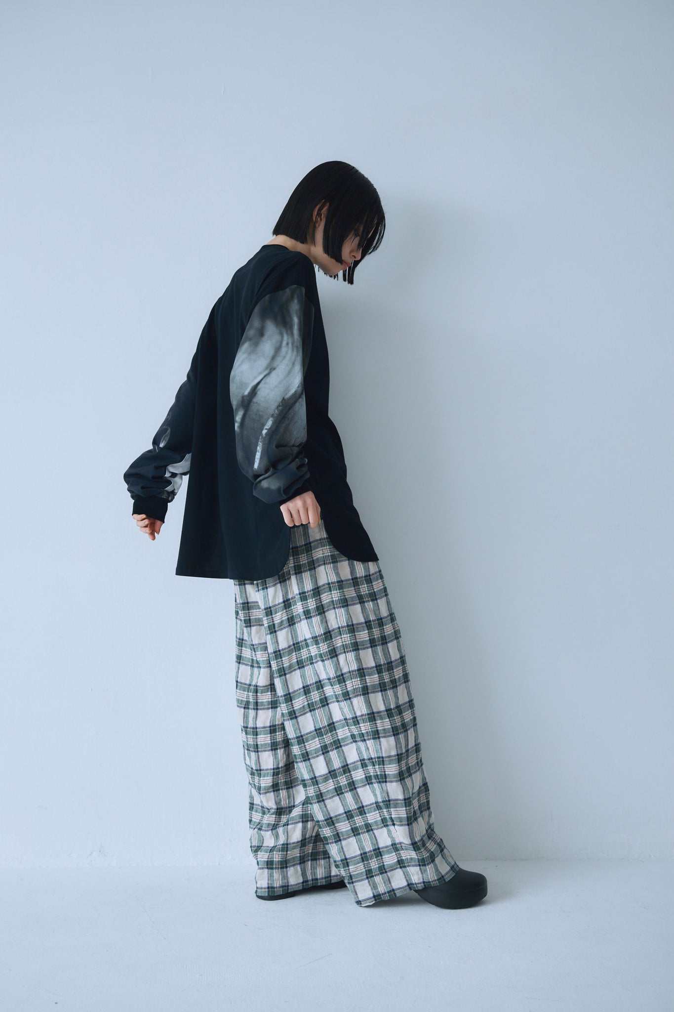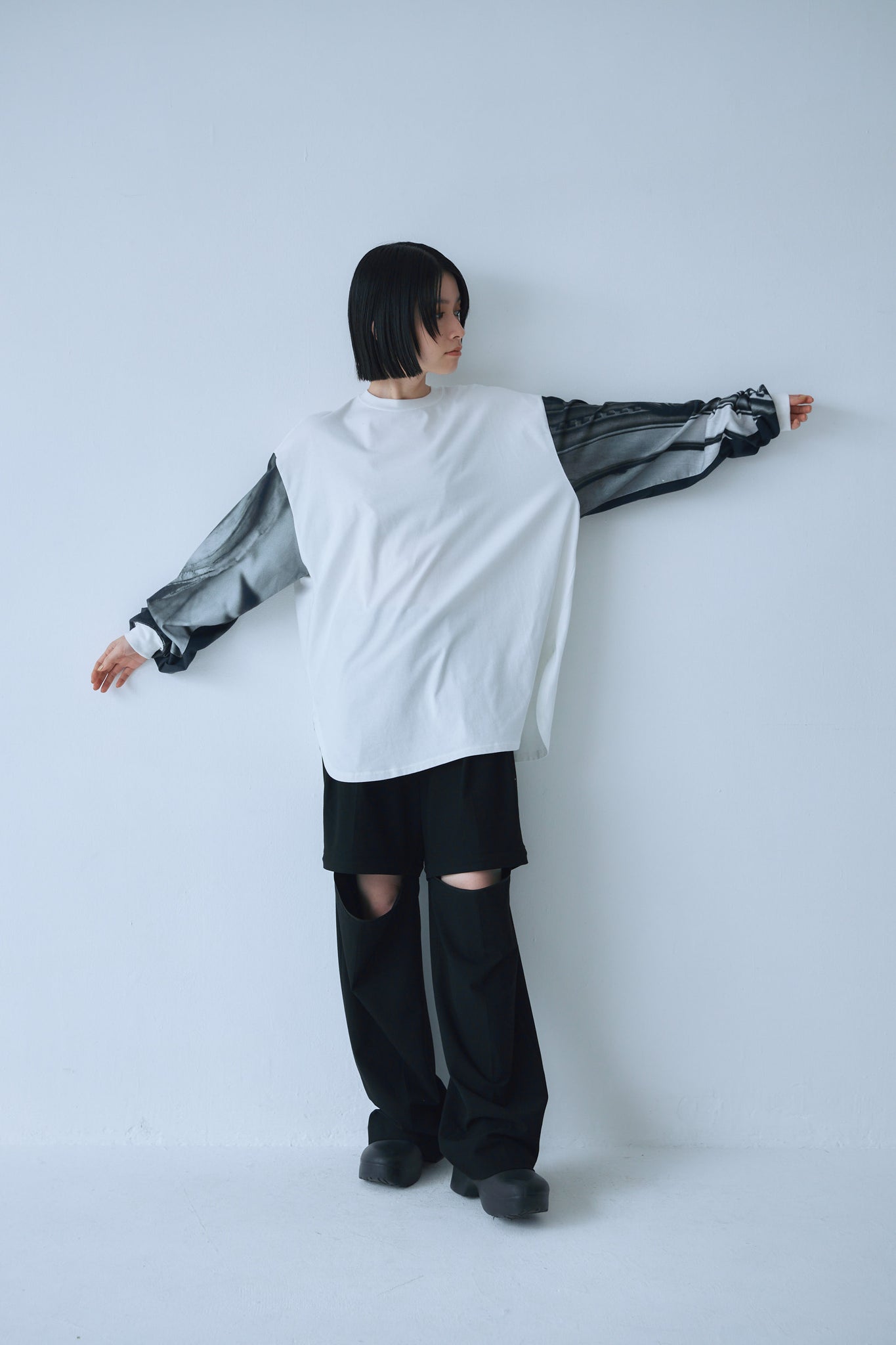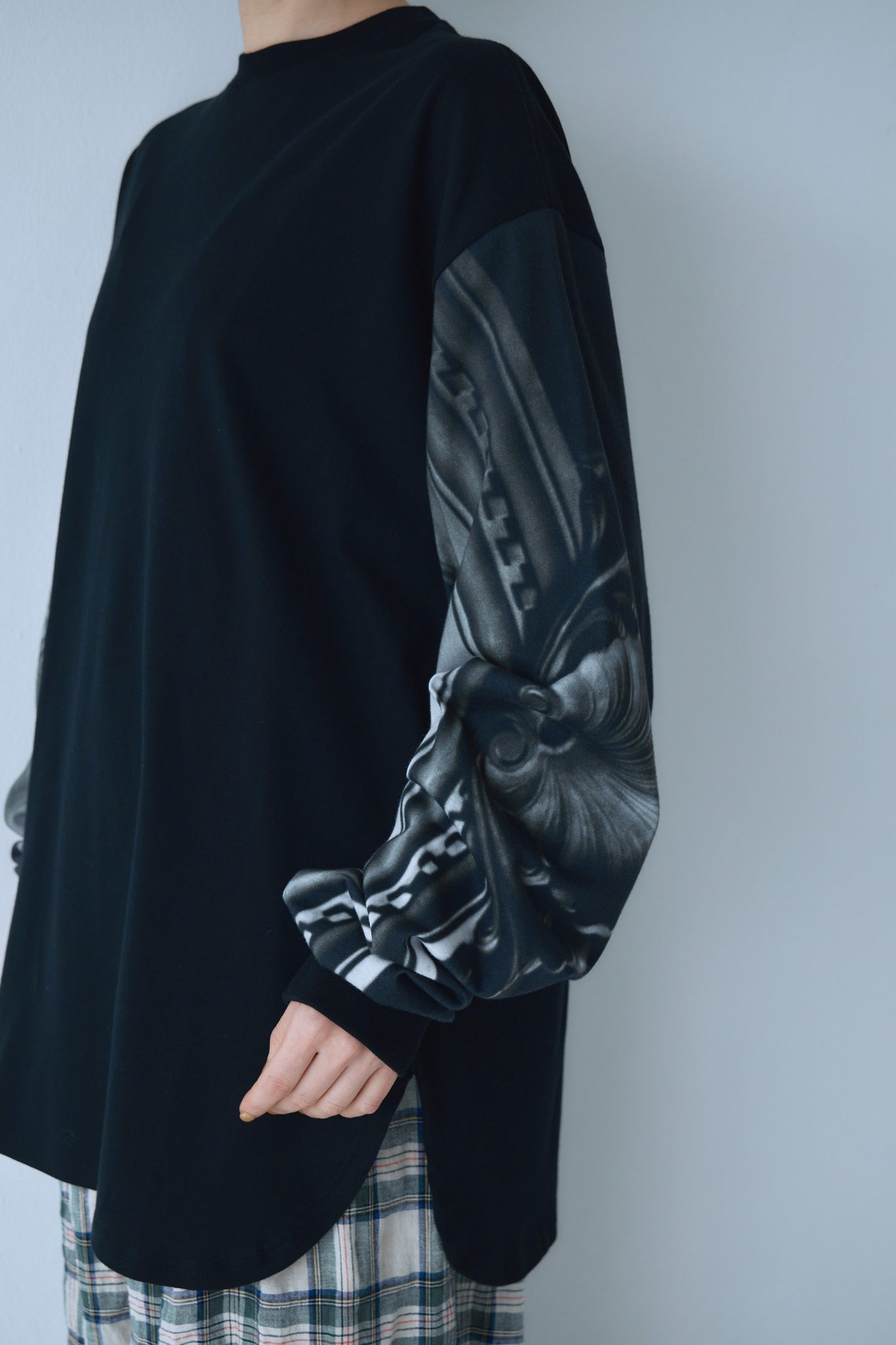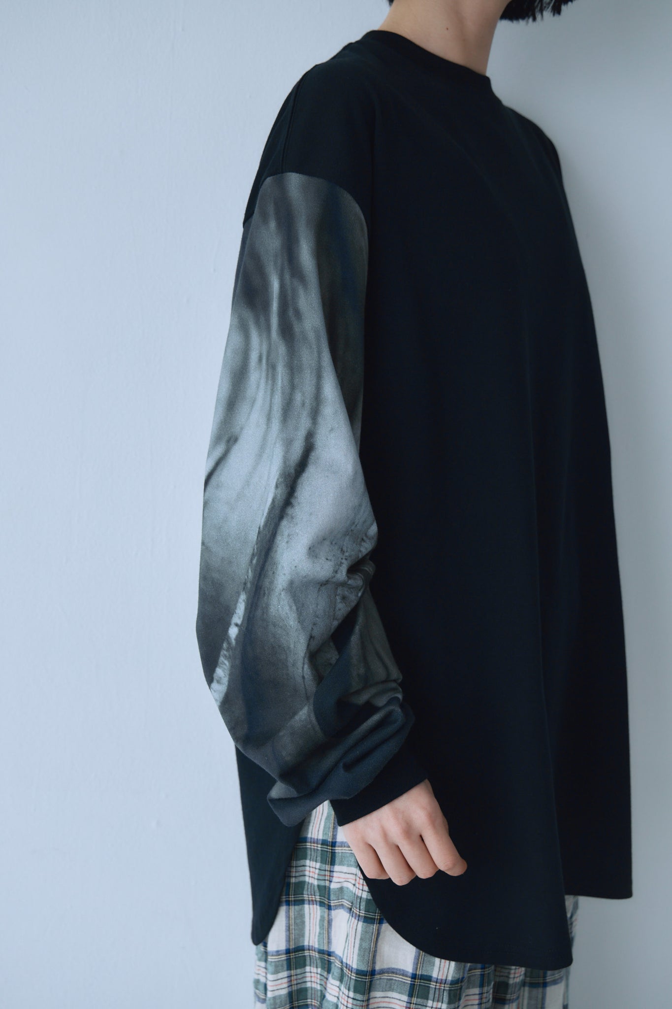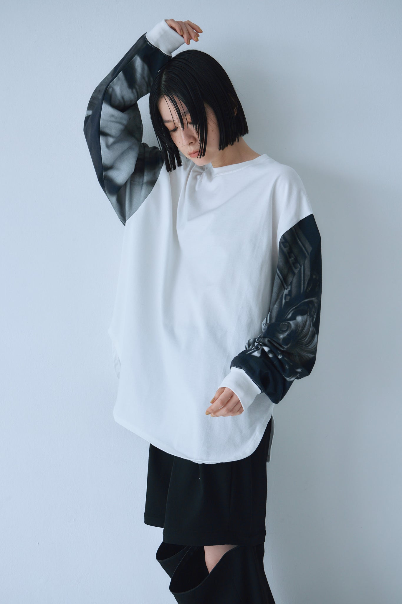 両袖に断片的な構図のPhotoプリントを施したLong Tee。