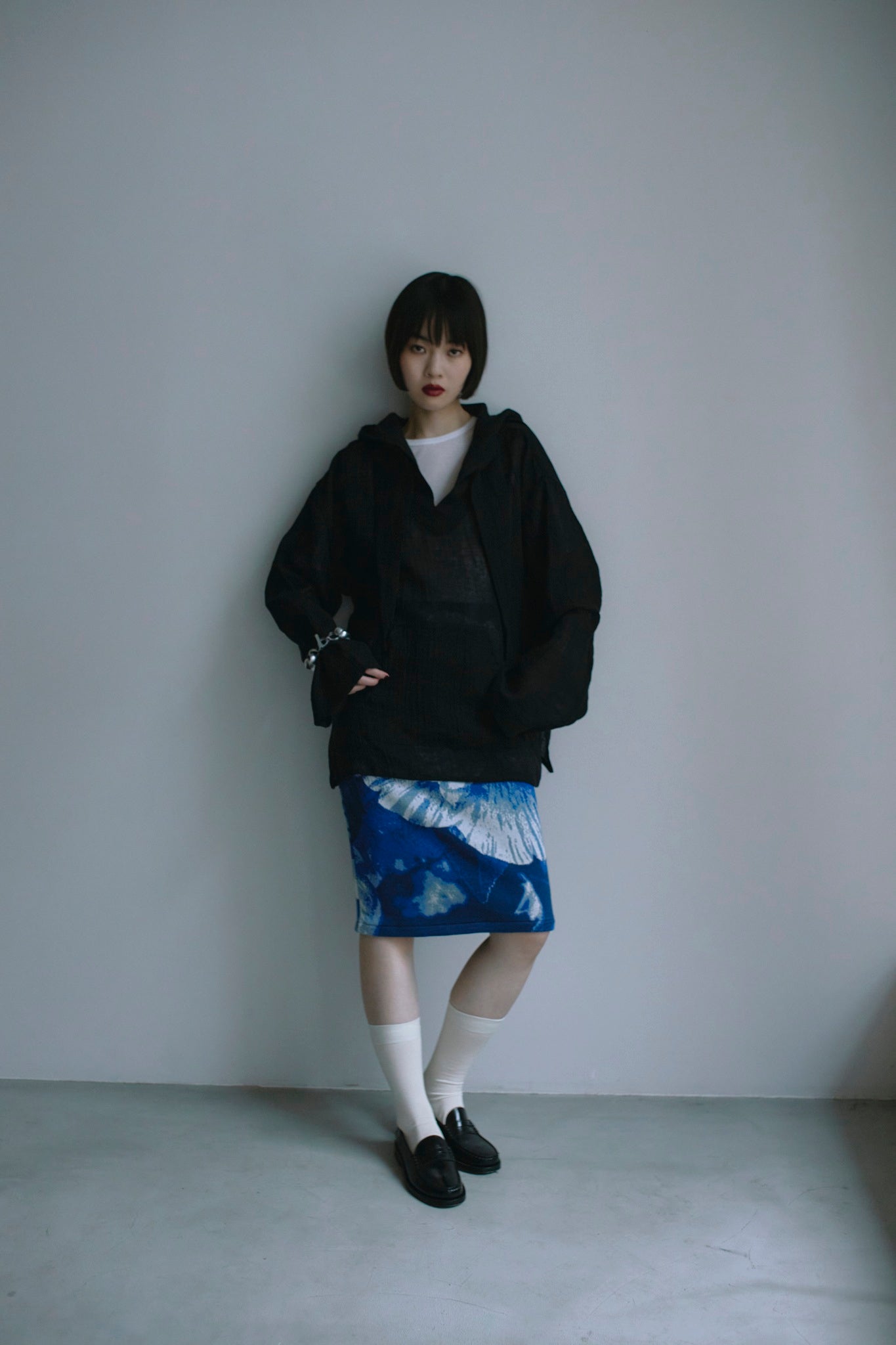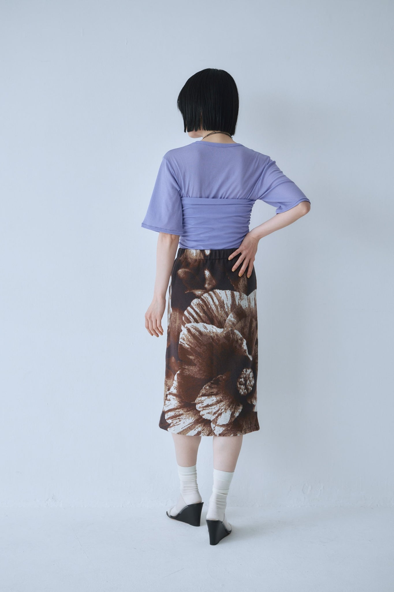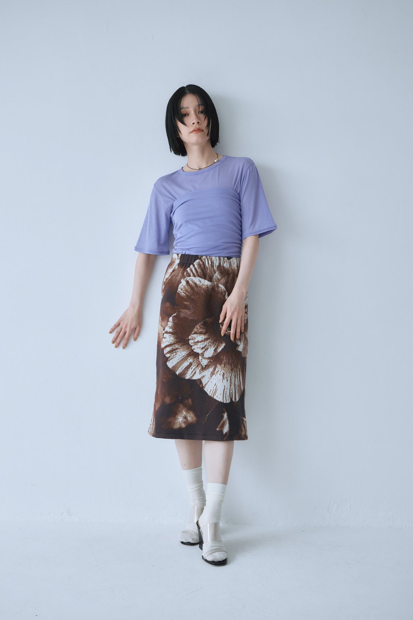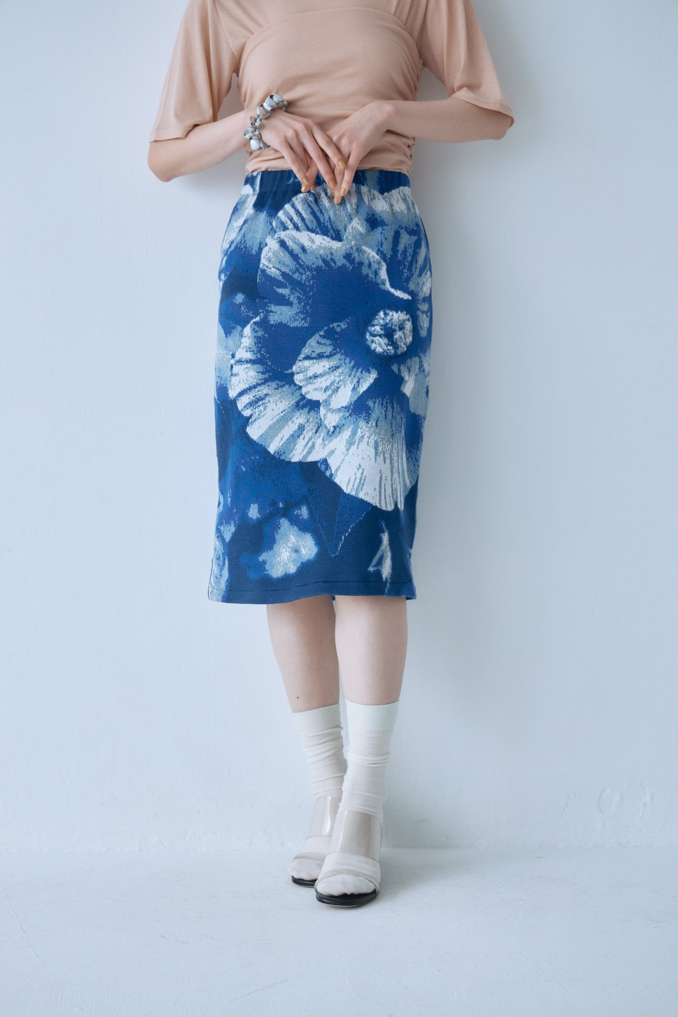程よくタイトなミディ丈スカートは、一枚でも、パンツを下に重ねて楽しめます。 大胆な柄の配置でインパクトのある仕上がりです。