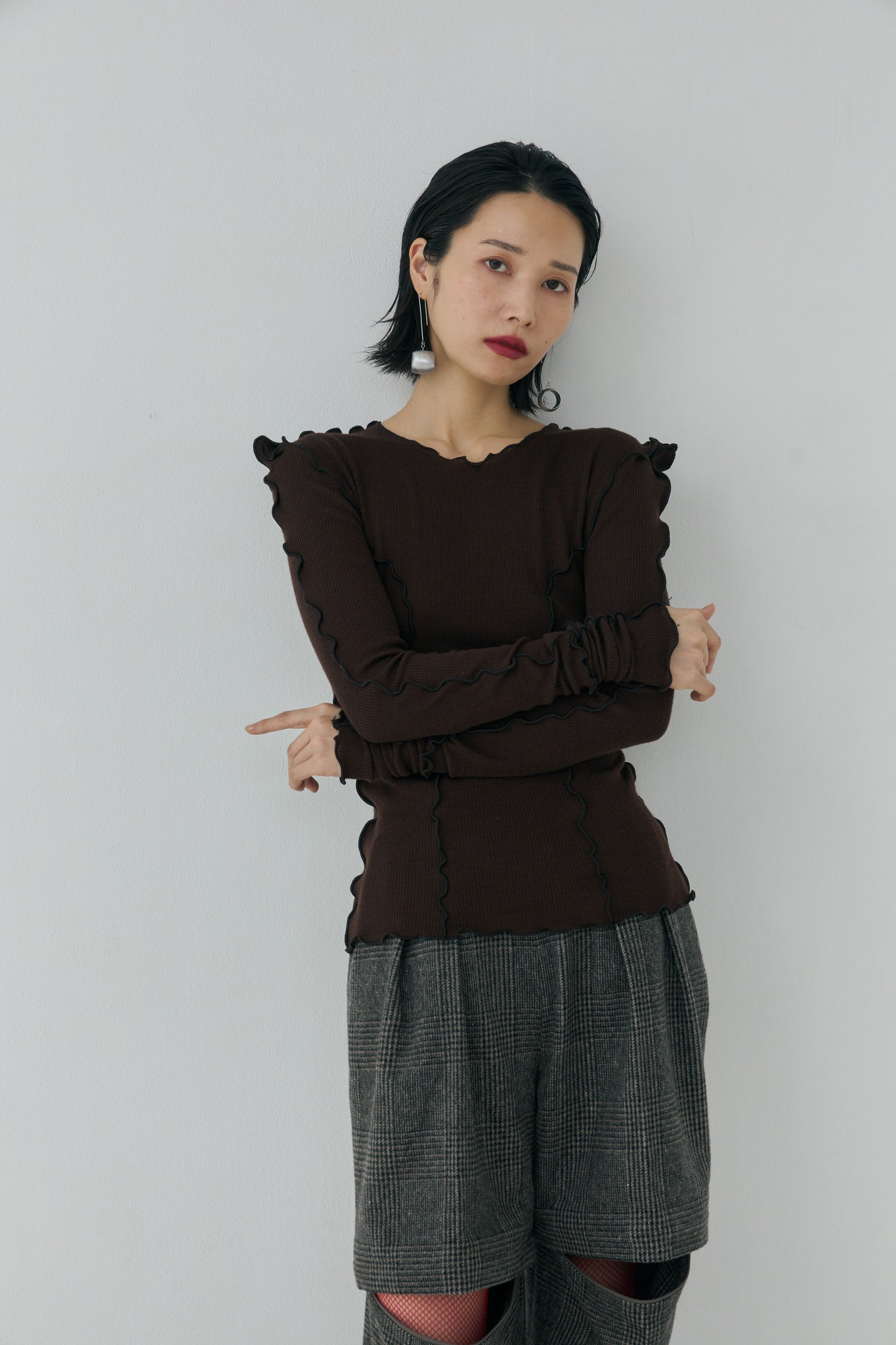 メローステッチで縁取りし、長めの袖とツンと尖る肩が印象的なデザイン。 しなやかな肌触りで心地よくフィットします。