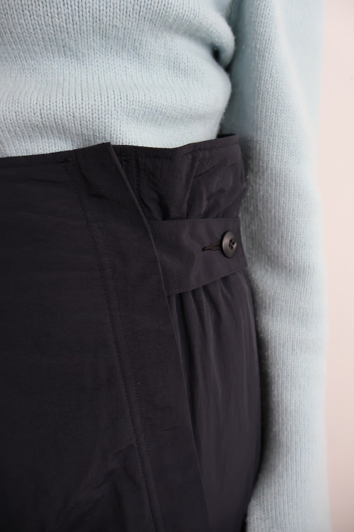 正面の長いファスナーが特徴で、裾の開閉バランスや、 内側にデザインされたベルトを利用して裾にアクセントをつけスタイリングのアレンジができ、 リバーシブルで表と裏、二つの顔を楽しんで頂けます。