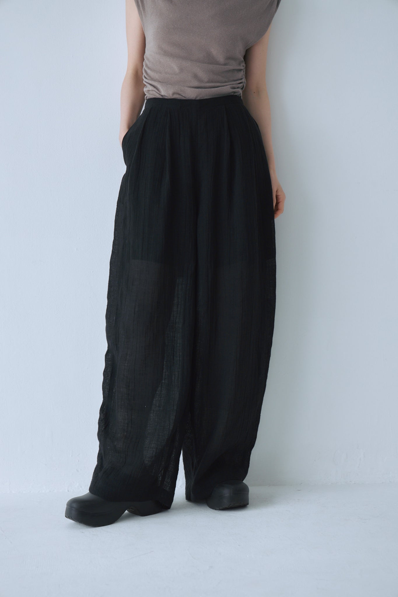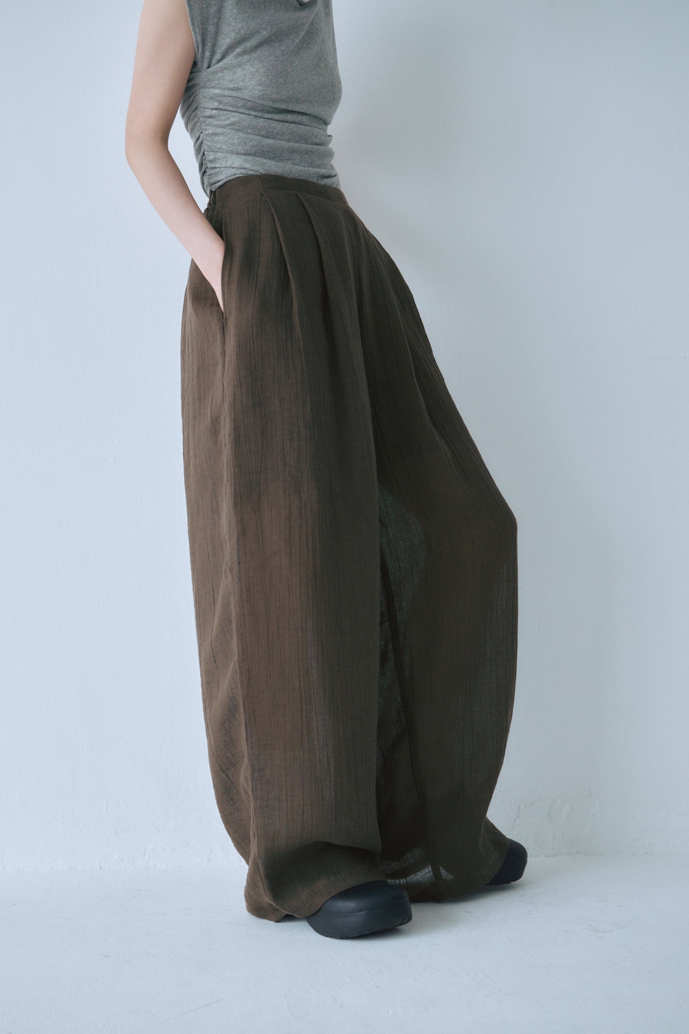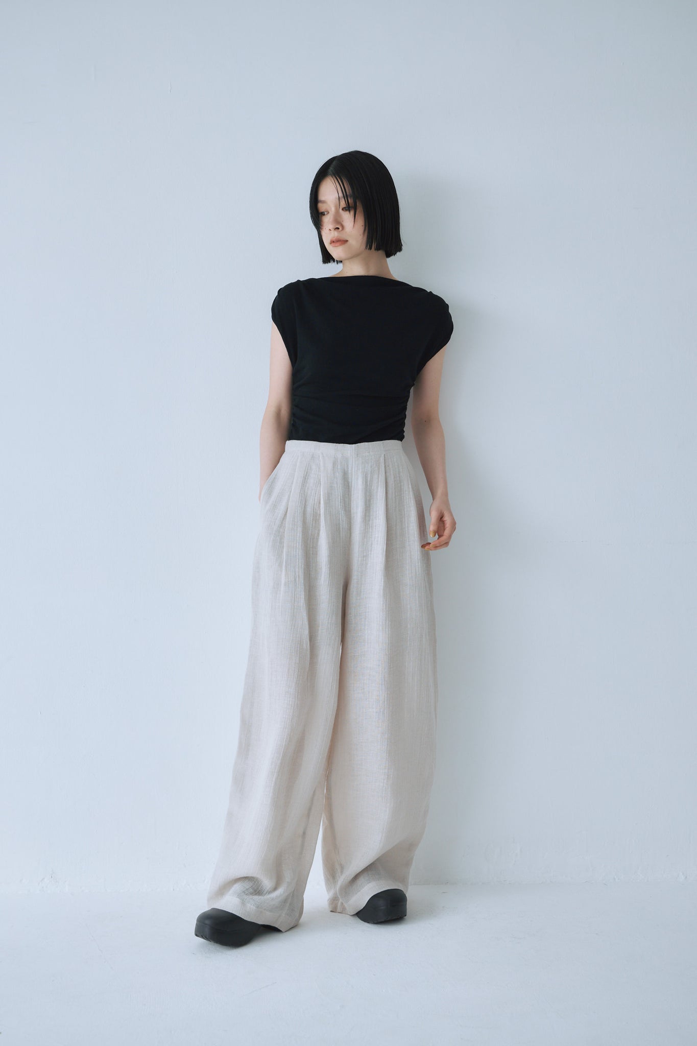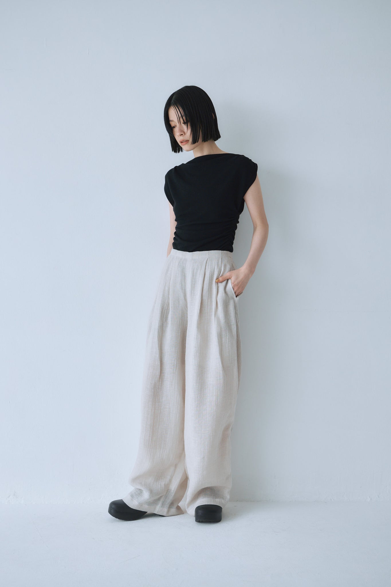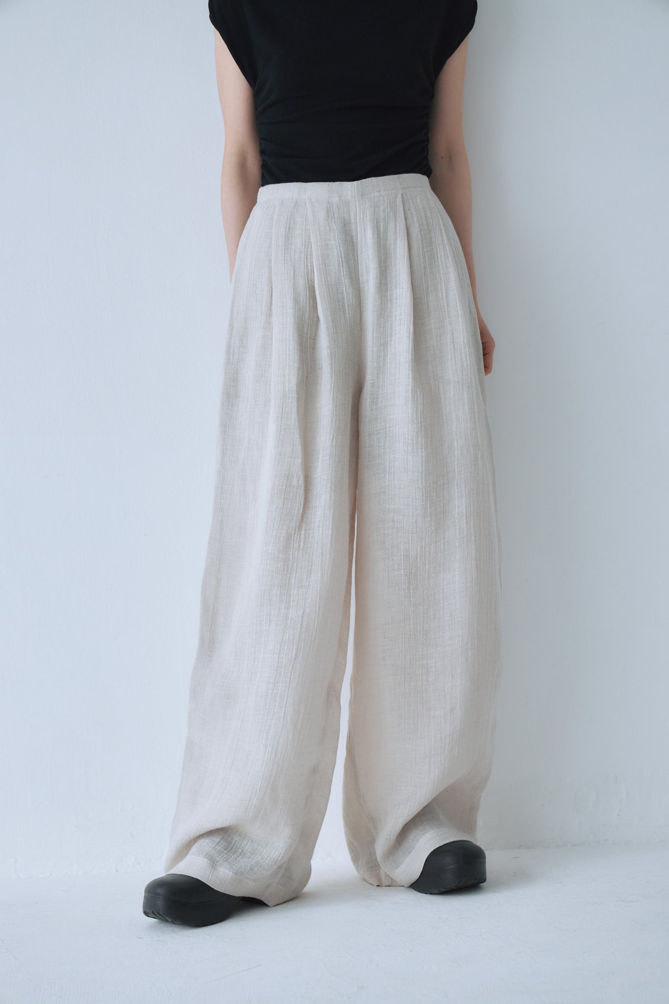 表情感があるしわ感が特徴のリネン100%のワイドパンツ。